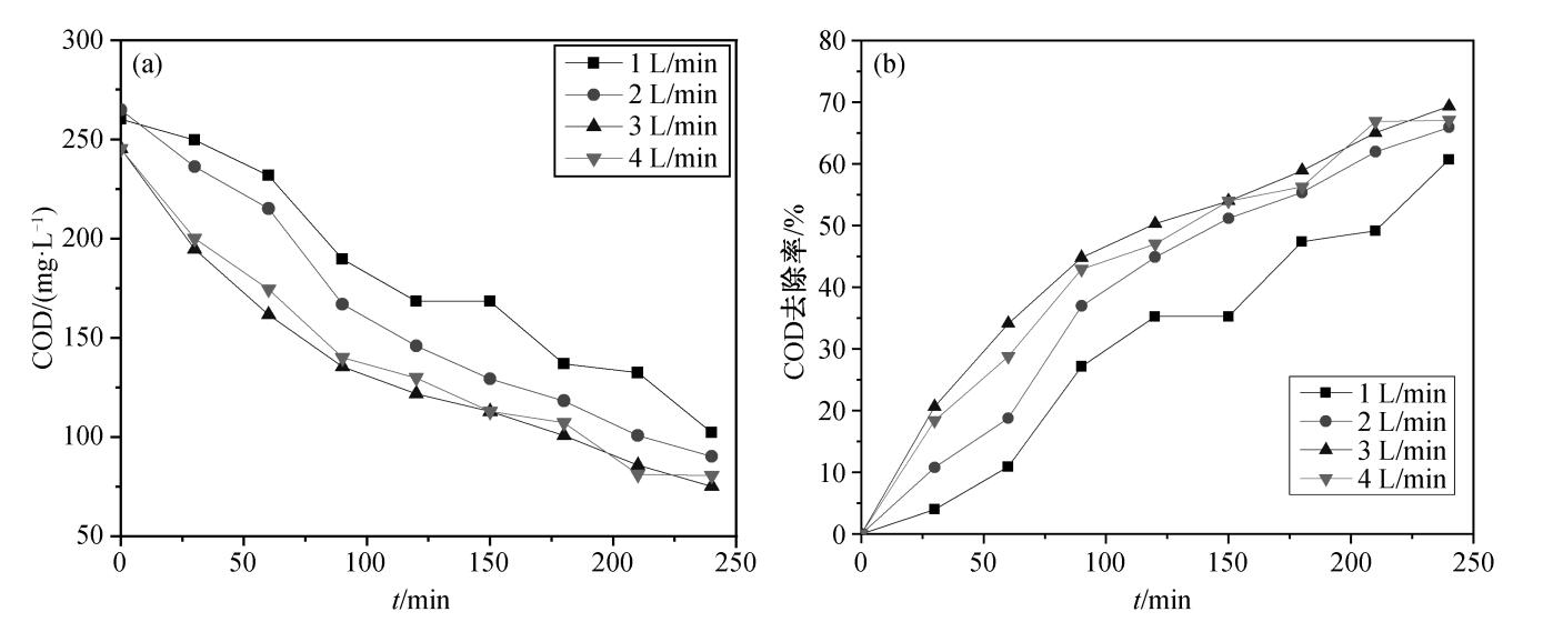 在催化劑投加量為 30%, 初始 pH 為 7 的條件下, 設(shè)置臭氧氣體流量分別為 1, 2, 3和 4 L/min, 探討臭氧氣體流量對催化臭氧化降解效果的影響, 實驗結(jié)果如圖 所示。
