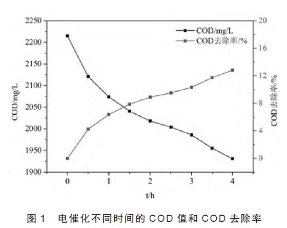 利用電催化處理該印染廢水,其結(jié)果見圖1。從圖1 中可以看出,隨著電解時(shí)間的延長(zhǎng),COD 值逐漸減小,但是COD 的去除率不大,到第4 h 時(shí),COD 的去除率為12.82%,對(duì)應(yīng)的COD 值為1 931mg/L,表明電催化法去除該印染廢水中的COD 效果不佳,分析原因可能是該廢水的pH 為強(qiáng)堿性,不利于電催化產(chǎn)生強(qiáng)氧化性的•OH。