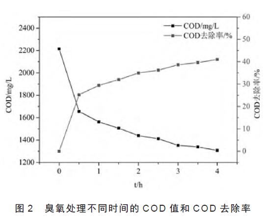 利用臭氧氧化技術(shù)處理該印染廢水,其結(jié)果見圖2。從圖2 中可以看出,隨著氧化時(shí)間的延長(zhǎng),COD 值逐漸減小。第1 h 時(shí),COD 的去除率達(dá)到29.43%,到第4 h 時(shí),COD 的去除率為40.98%,對(duì)應(yīng)的COD 值為1 308 mg/L,表明臭氧氧化法該印染廢水中的COD 的去除具有一定的效果,分析原因是堿性條件下,臭氧分解快,羥基自由基氧化作用大,COD 的去除率增加。