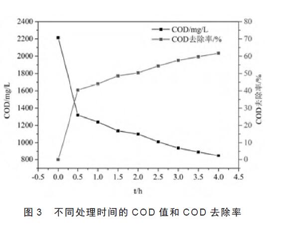 3 電催化臭氧氧化協(xié)同處理印染廢水利用二維電催化+ 臭氧協(xié)同作用處理該印染廢水,在處理過程中pH 逐漸降低,但降低幅度較小。隨著反應(yīng)時(shí)間的增加,COD 值逐漸降低。在1.0 h 時(shí),COD 值降低幅度 很大,由2 215 mg/L 降到1 240 mg/L,去除率為44.02%,反應(yīng)延長(zhǎng)至4 h 時(shí),COD 值降低至847 mg/L,對(duì)應(yīng)的去除率為61.76%。結(jié)果表明電催化+ 臭氧協(xié)同處理技術(shù)對(duì)COD 的去除效果較好,分析原因可能是電催化進(jìn)行電解時(shí),在極板之間產(chǎn)生大量的細(xì)小氣泡,增大臭氧氣體的接觸面積,促使臭氧大量進(jìn)入液相或者在氣液界面反應(yīng),提高了臭氧的利用效率。
