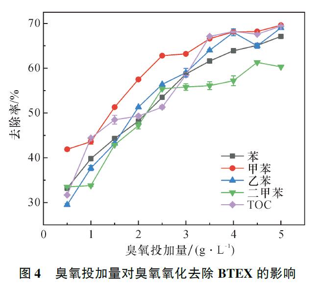 2.3臭氧投加量對臭氧氧化降解BTEX的影響