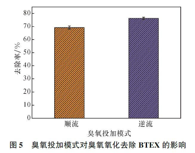 從圖5可以看出,當昊氧的投加模式為順流時,BTEX的去除效率為69.2%;當臭氧的投加模式為逆流時,其降解效率為76.3%,增加了7.1%。
