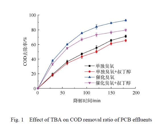 臭氧與有機物的反應主要有 2種途徑,即直接反應和間接反應。直接反應是指 O3直接氧化有機物,間接反應主要是通過 O3分解產生的活性自由基對有機物進行氧化。通過研究 · OH淬滅劑的影響進行對比實驗,研究 · OH對有機物的降解作用。TBA 是一種常見的 · OH淬滅劑,它與臭氧分子基本不反應,反應速率僅 3×10-3 L·(mol·s)−1,而其與 · OH的反應速率高達 6×108 L·(mol·s)−1。因此,可以通過加入 TBA 到臭氧或催化臭氧過程,間接檢測體系中是否有 · OH 的產生。圖 1為單獨臭氧氧化過程以及催化臭氧氧化過程加入TBA前后廢液的 COD 去除率對比圖。由此可知,CaO催化臭氧氧化過程和單獨臭氧氧化過程加入 TBA后,處理 180 min后,COD去除率分別降低 13.04%和 5.71%,表明 TBA的加入對 2個過程降解率均造成負面影響,從而間接證明單獨臭氧氧化過程與催化臭氧氧化過程都有 · OH產生。此外,從 TBA對 2個過程的影響程度上可以看出,CaO可以促進 O3產生更多的 · OH,表明 CaO催化臭氧氧化過程遵循羥基自由基機理。