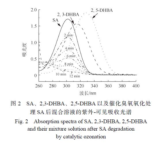 圖 2為 SA、2,3-DHBA和 2,5-BHBA的紫外-可見吸收光譜圖以及 CaO催化臭氧氧化處理后的紫外-可見吸收光譜??梢钥闯觯琒A在 302 nm處有 很大吸收峰,而 2,3-DHBA和 2,5-DHBA分別在315 nm和 330 nm處出現 很大吸收峰,SA經過催化臭氧氧化處理后 很大吸收峰波長向右移動,在2,3-DHBA和 2,5-DHBA的大吸收峰處有一定的吸收,證明在該過程中有 · OH產生。