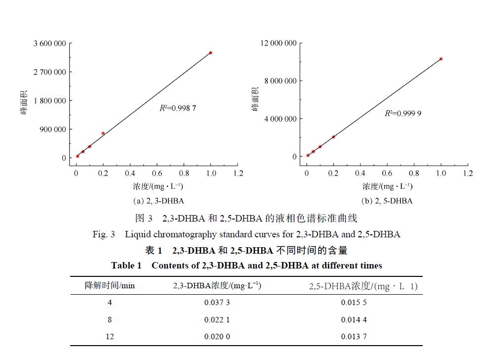 從圖2中可以觀察到2,3-DHBA和2,5-DHBA的存在,接下來使用LC-MS聯用儀對2,3-DHBA和 2,5-DHBA 的含量進行定量分析。圖 3(a)和圖 3(b)分別表示 2,3-DHBA 和 2,5-DHBA的液相色譜標準曲線,根據該標準曲線求得 CaO催化臭 氧 處 理 不 同 時 間 溶 液 中 2,3-DHBA和 2,5-DHBA的含量,結果如表 1所示。
