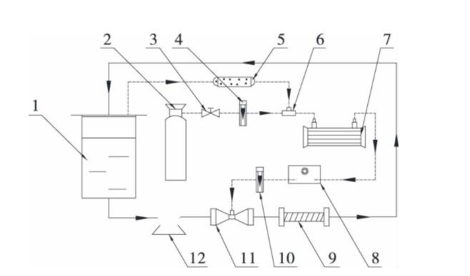 1. 儲液罐 2. 氧氣瓶 3. 減壓閥 4、10. 流量計(jì) 5. 干燥管 6. 三通閥 7. 臭氧發(fā)生器 8. 調(diào)節(jié)氣泵 9. 靜態(tài)混合器 11. 射流器 12. 離心泵