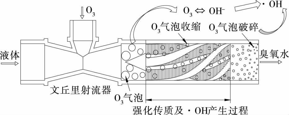 圖2 靜態(tài)混合器強(qiáng)化臭氧傳質(zhì)及·OH產(chǎn)生原理