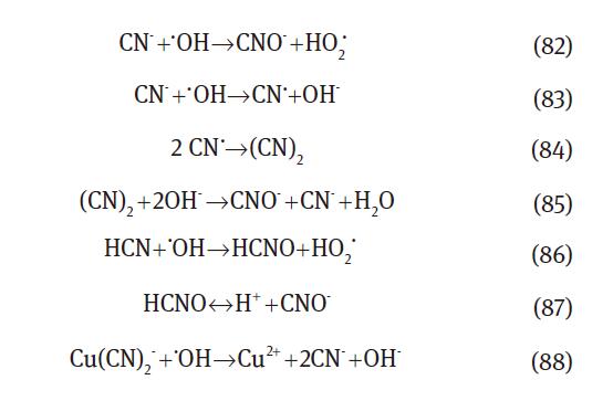 廢水中的氰化物由于具有毒性作用而成為重要的問題,通常以氰化氫,陰離子和各種氰化物配合物的形式存在。氣相或水相中的游離氰化物離子(包括氰化物陰離子和氰化氫)是 很劇毒的形式(Dash等,2009)。由于氰化物與臭氧的強(qiáng)烈反應(yīng)性和氰化物的完全消除而不會(huì)產(chǎn)生不希望的副產(chǎn)物,因此各種來源的氰化物臭氧化前景廣闊。氰化物臭氧化的主要產(chǎn)物是氰酸鹽,可通過水解或臭氧化過程進(jìn)一步降解,但是反應(yīng)速度比氰化物的氧化速度慢(Mert等人,2014)。相比之下,臭氧分解產(chǎn)生的˙OH氧化氰化物的方法是通過以下兩種途徑生產(chǎn)危害較小的中間體CNO [Eq.(82)和Eqs.(83-85)](Gurol and Bremen 1985a)。盡管氰化氫與臭氧的反應(yīng)性較弱,但它很容易被˙OH介導(dǎo)的反應(yīng)降解[Eqs(86–87)]。