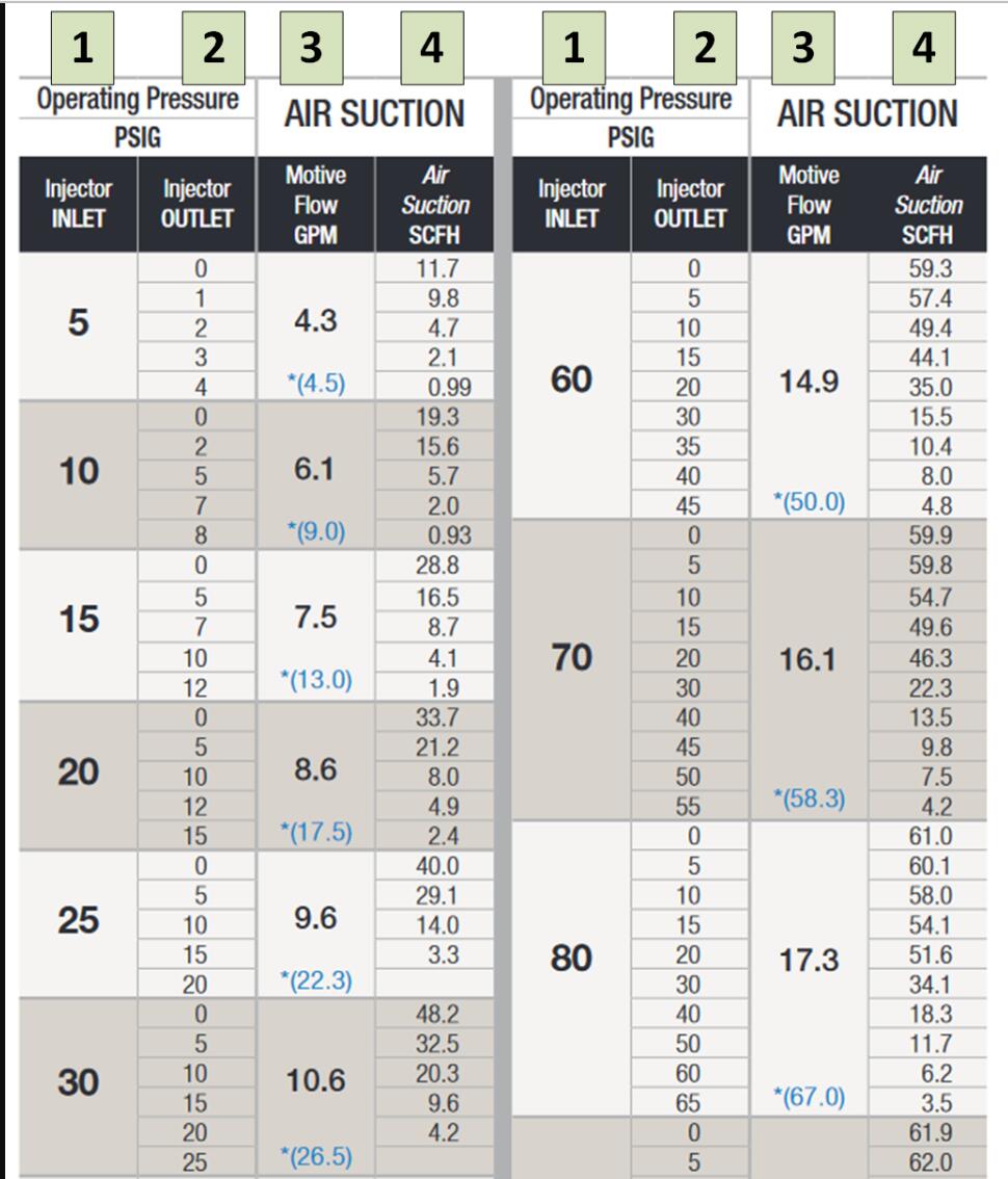 很后一欄稱為空氣吸力,列出了在這些對(duì)齊的射流器入口/出口壓力下可以吸入水流的氣體(氧氣,臭氧,空氣)的數(shù)量。