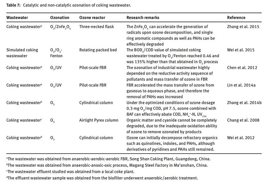 焦化廢水由于其復(fù)雜的組成和劇毒特性而受到了廣泛的關(guān)注。經(jīng)過生物處理后,焦化廢水中仍殘留有酚類、苯類、多環(huán)芳烴(PAHs)和含氮雜環(huán)化合物。如表7所示,可以通過基于臭氧的技術(shù)有效地消除焦化廢水中的這些不可生物降解的有機(jī)污染物。可以發(fā)現(xiàn), 很關(guān)注的研究興趣在于降低焦化廢水出水的潛在風(fēng)險,以及減少廢水中的有機(jī)污染物。通過與活性催化劑結(jié)合,提高臭氧的氧化能力。