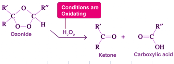 氧化處理:當使用氧化劑過氧化氫代替鋅或二甲基硫來處理該臭氧化物時,所形成的醛被氧化為羧酸。 高熱酸存在下的高錳酸鉀也可用于氧化處理。