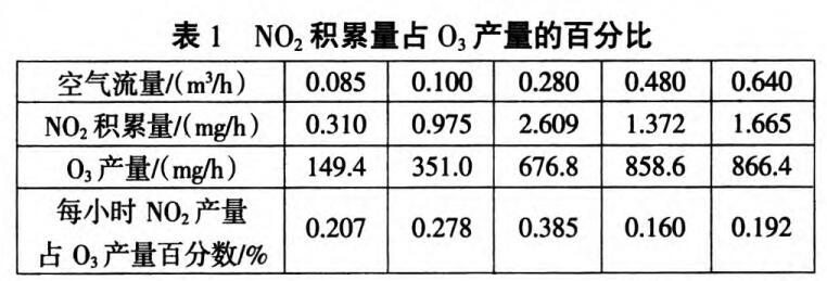由表l可看出,隨著空氣流量增大(0.10 m3/h~0.64 m3/h),臭氧產(chǎn)量由351.0 mg升高到866.4 mg,NO2的產(chǎn)量在0.975mg~2.609 mg之間波動;當(dāng)空氣流量為0.64 m3/h時,臭氧產(chǎn)量增幅不明顯,且NO2產(chǎn)量高于空氣流量為0.48 m3/h時的產(chǎn)量。原因是發(fā)生器在該流量下工作時溫度較高,臭氧分解率較高,由于空氣流量大,發(fā)生腔中氣體平均停留時間短,導(dǎo)致臭氧生成速率低于分解速率,而此時卻有利于NO2的形成。