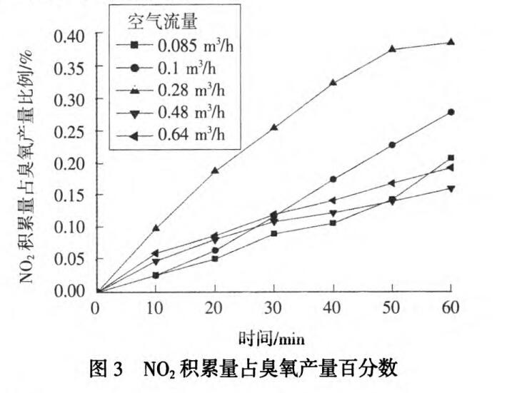 調(diào)節(jié)空氣進氣流量為0.10 m3/h、O.28 m3/h、048 m3/h、O.64 m3/h,在不同流量下測定NO2產(chǎn)量(見圖1)。該臭氧發(fā)生器在每個空氣流量下,NO2產(chǎn)量都隨時間的增加而增大,并且隨著空氣流量的增大,NO2產(chǎn)量先增大后減小,空氣流量為0.28 m3/h時,其時產(chǎn)量很大;空氣流量為0.64 m3/h時NO2產(chǎn)量又高于空氣流量0.48m3/h時NO2的產(chǎn)量。