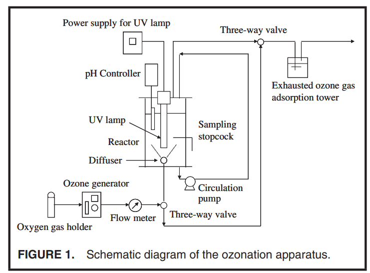 H2O2的濃度分別為16.7、50.1、100.2、200.4和400.8 mg L−1。將1.6 L的樣品溶液置于30 cm高、9.5 cm內徑的反應器中,在常溫下用含29.2-36.9 mg臭氧/L的鼓泡氧氣以0.5 L min - 1的流速處理4 h。臭氧化氣體由臭氧發生器產生。作為對照處理,分別進行pH 6 ~ 8的臭氧化處理,20、120 W的低壓紫外燈紫外照射,0.5 L min - 1的氧氣曝氣,0.1、0.3、0.6、1.2、2.4 mL的H2O2加入。通過加入1 N HCl或1 N NaOH,將溶液的pH控制在6-8。