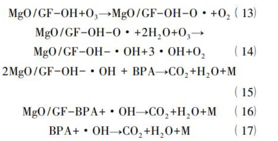 Zhang等利用高比表面積、可折疊的石墨氈(GF)為載體,采用等體積浸漬法制備了MgO/GF催化劑。在中性條件下降解雙酚A(BPA)的過程中發(fā)現(xiàn),與單獨臭氧化過程相比,加入MgO/GF催化劑可以使BPA和COD的去除率分別增加40.0%和31.6%。通過加入羥基自由基猝滅劑———叔丁醇,間接證明了MgO/GF/O3體系主要遵循羥基自由基的反應(yīng)機理。同時對反應(yīng)過程中溶解臭氧濃度進行檢測,發(fā)現(xiàn)加入催化劑后溶液中的臭氧濃度始終處于較低水平。因此,作者認(rèn)為MgO/GF可以提高臭氧化效率的原因主要是催化劑表面的堿性位可以促進臭氧分解產(chǎn)生·OH,如下述方程式所述。