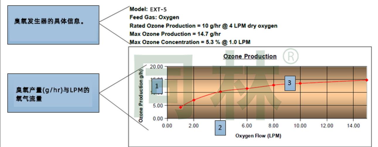 1. 臭氧產量顯示在垂直(Y軸)的圖形上,單位為克/小時或其他臭氧輸出測量單位