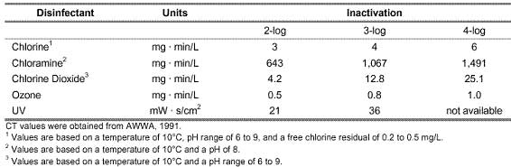 原生動物隱孢子蟲很難被氯和氯胺滅活。對于1-log失活(= 90%失活),氯失活的Ct值在3000和4000mg min / L之間變化。兩個表都來自環境保護局(EPA)。